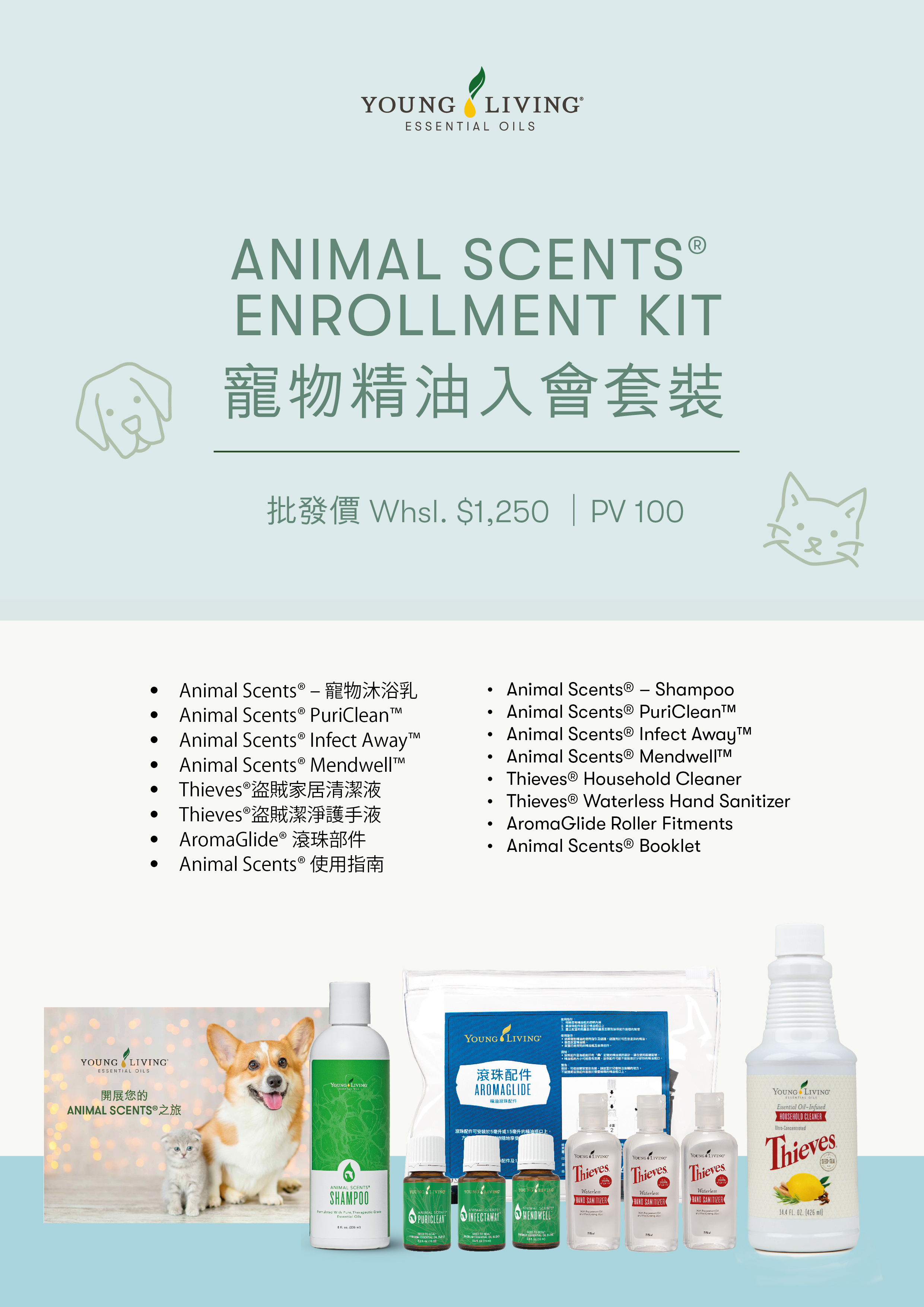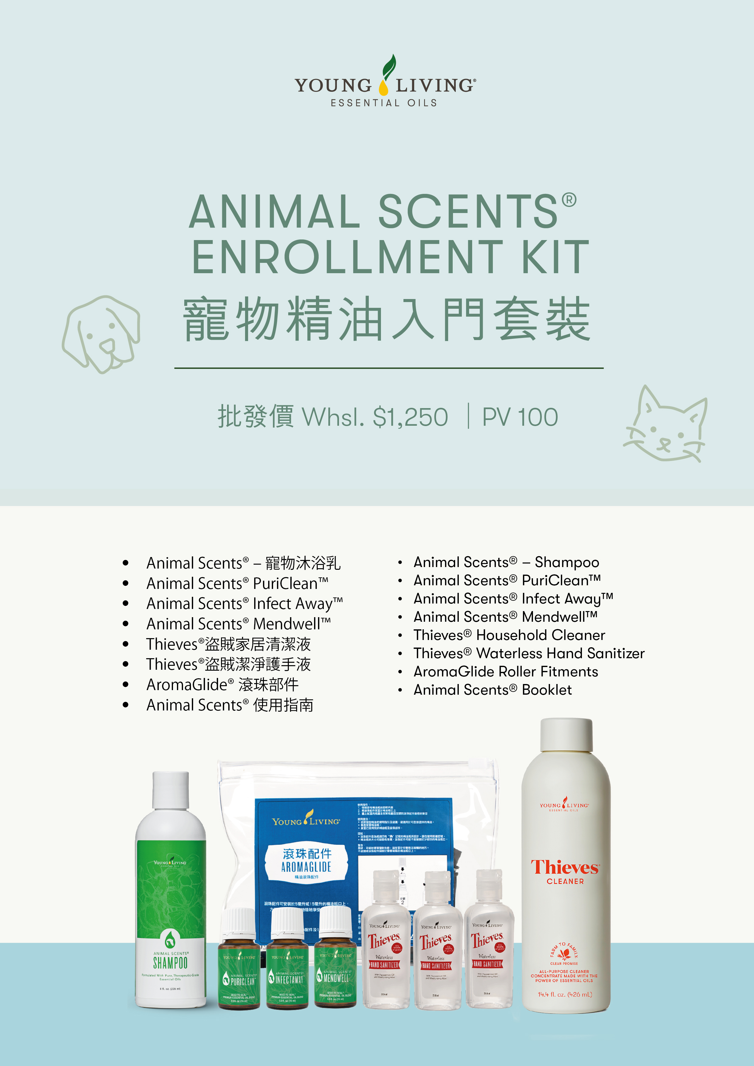 Animal Scents®寵物精油系列專為寵物配製,屬獸醫專用配方, 所有產品均經過預先稀釋和混合,以方便寵物日常使用。全系列產品為您的寵物帶來新的香氣和體驗,配合Thieves系列產品,為寵物營造無毒的生活環境。