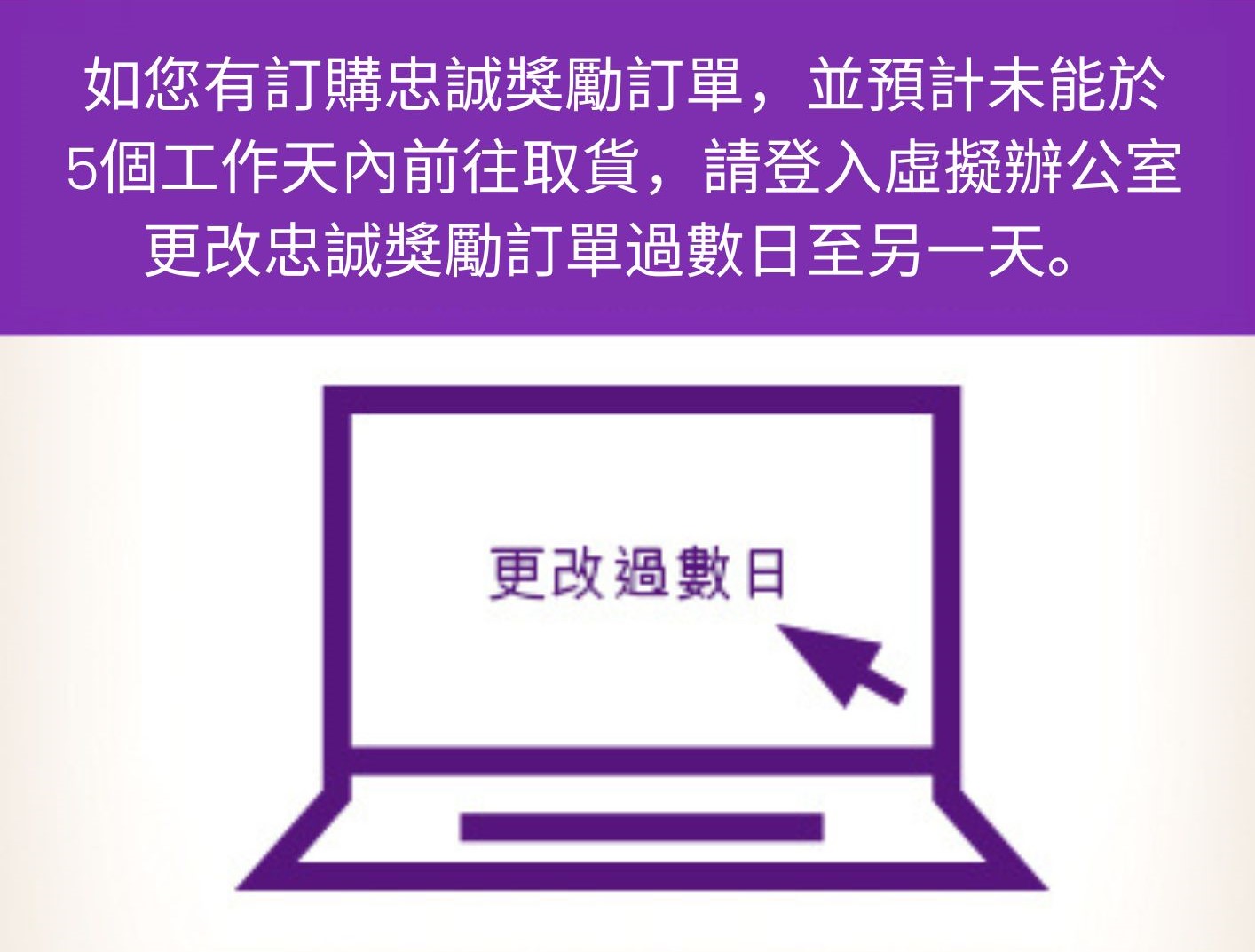 因此,我們建議會員在下單前安排好取貨時間。如有訂購忠誠獎勵訂單,並預計未能於 5 個工作天內前往體驗中心取貨,請登入虛擬辦公室更改忠誠獎勵訂單過數日至另一天。如有外遊或公幹的打算,建議預早選用本地送貨服務,並將貨件寄至親友家代收。請按此了解本地送貨服務詳情。