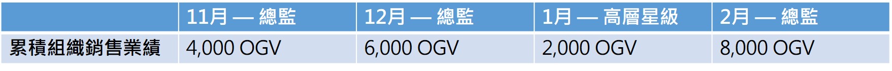 合資格月份組織銷售業績(OGV)達到最少10,000;