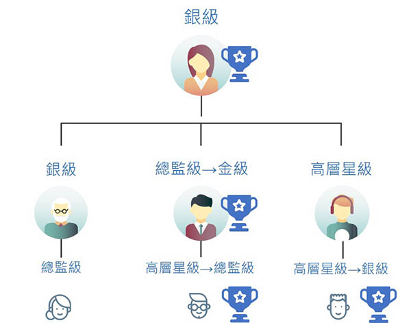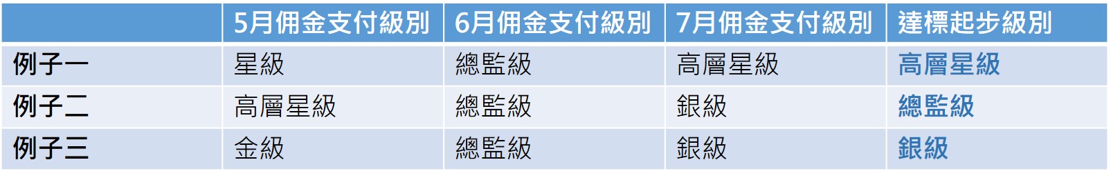 例子一:某會員在5月達到星級、6月達到總監級、7月達到高層星級 — 兩個最高月份級別分別為6月總監級及7月高層星級。而較低者高層星級即是該會員起始級別。