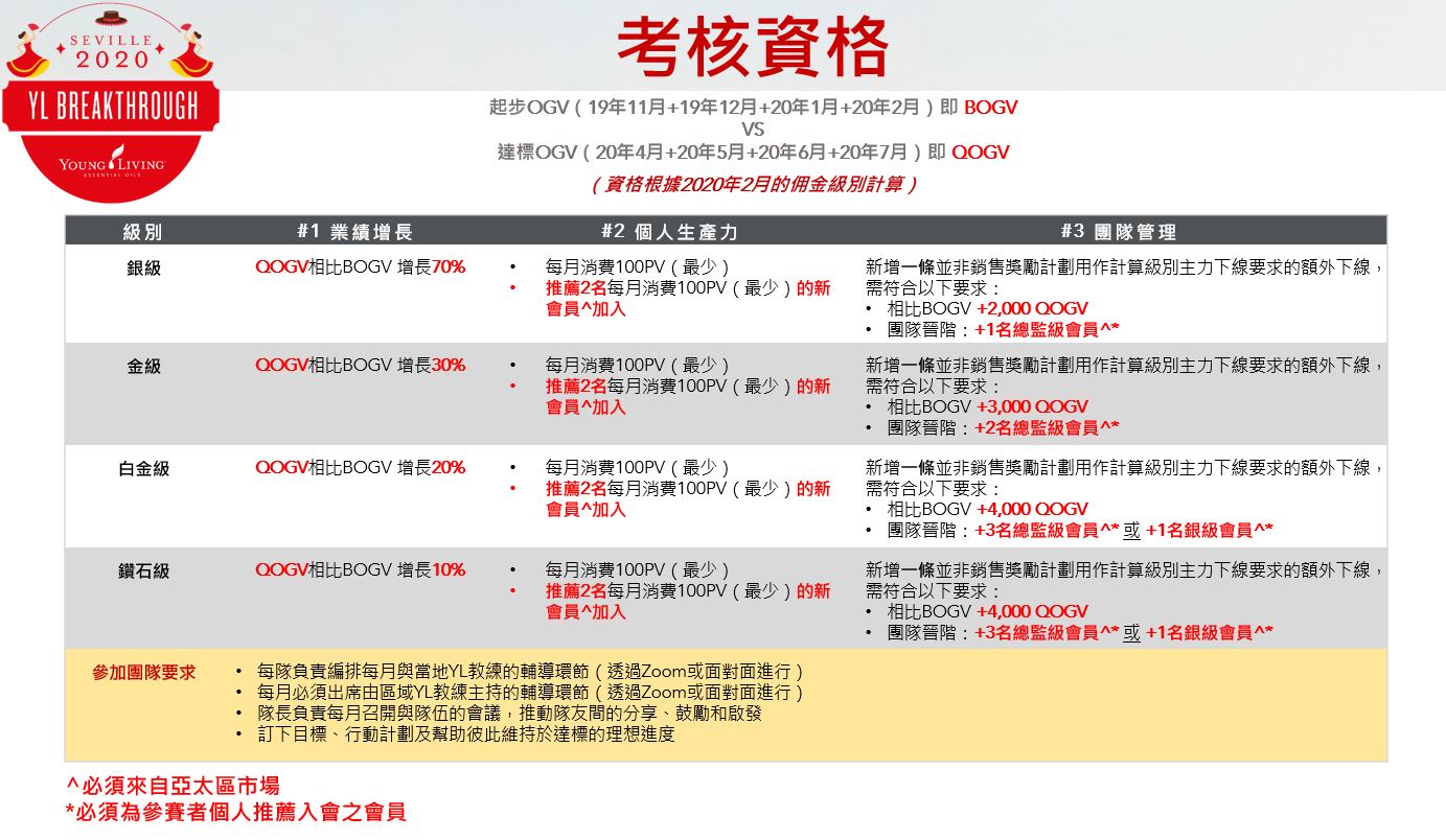 YL Breakthrough 2020(YLB)由Young Living香港分公司(「Young Living」)贊助。達標期限自2020年4月1日香港時間凌晨0時01分開始,至2020年7月31日香港時間晚上11時59分截止。Young Living於YLB計劃的計時方式為最終依據且無可爭議。在達標期限結束後,Young Living將依據下列之預設標準,與每位合資格Young Living會員(「會員」)的級別,選出得獎者。級別以Young Living銷售獎勵計劃所列為準。