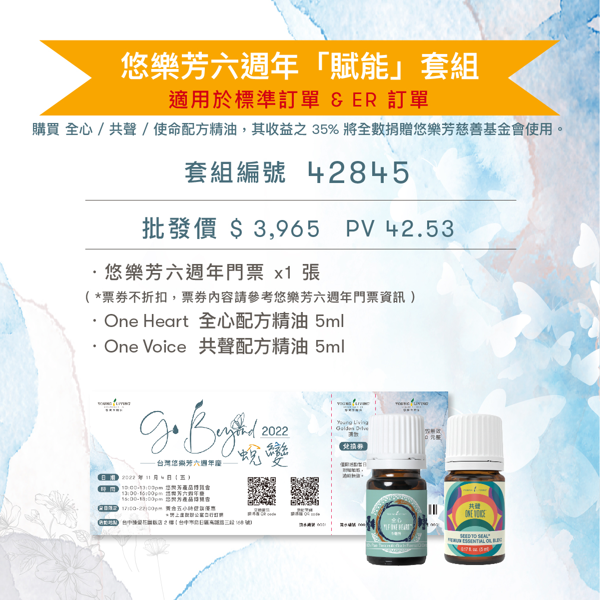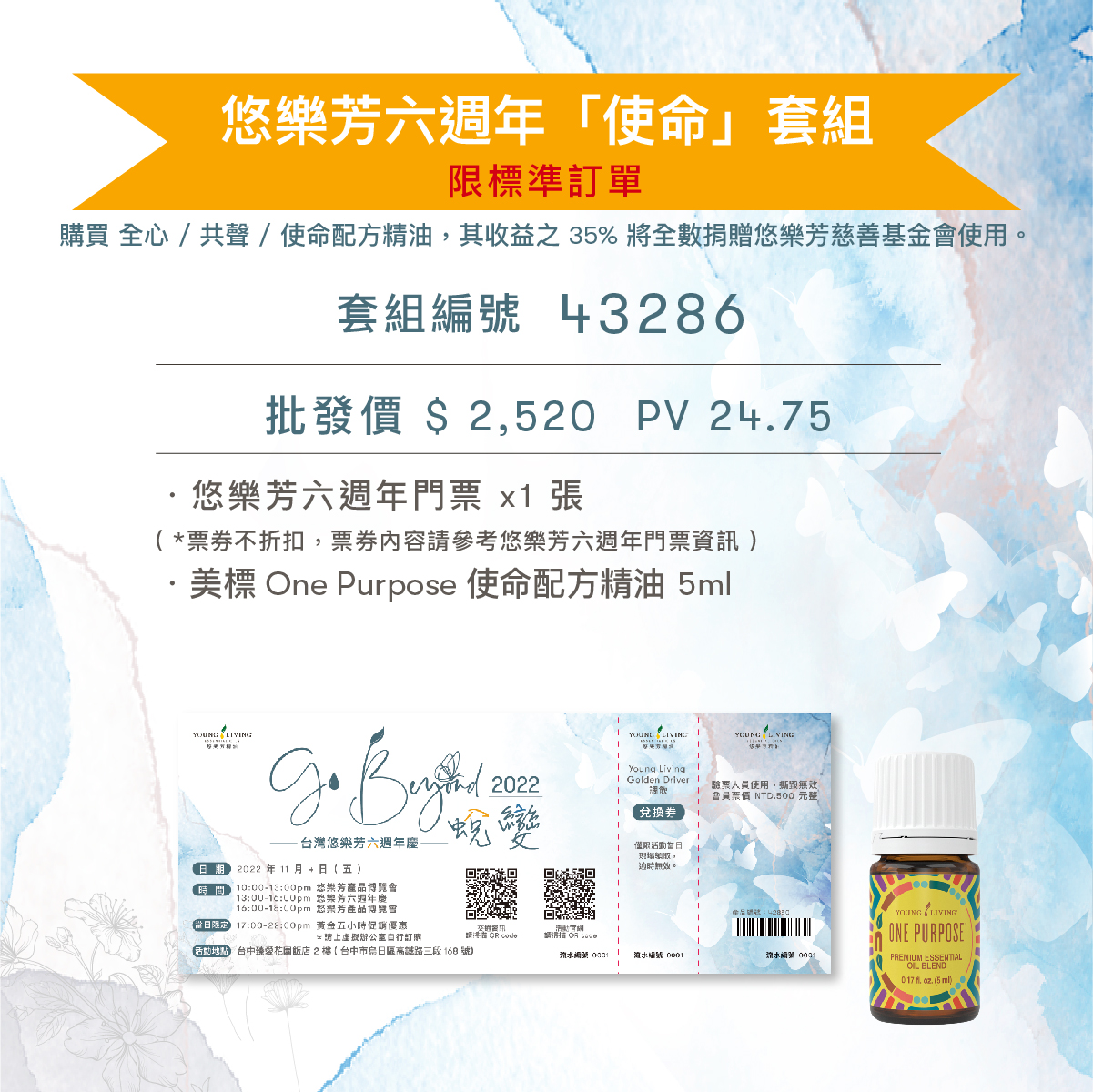 本套組內含悠樂芳六週年門票乙張,及2022年悠樂芳基金會和東非烏干達Mabira Collective 於賦能計畫中所合作調製,代表著韌性與團結的美標「One Purpose使命配方精油」。在不同的香氣中,享受著精油傳遞的氛圍,同時獲得了信念、信仰、自信與勇氣,使精油渲染內心擁有正向動力,實現個人期許目標,喚醒鼓舞人心的生命力! |