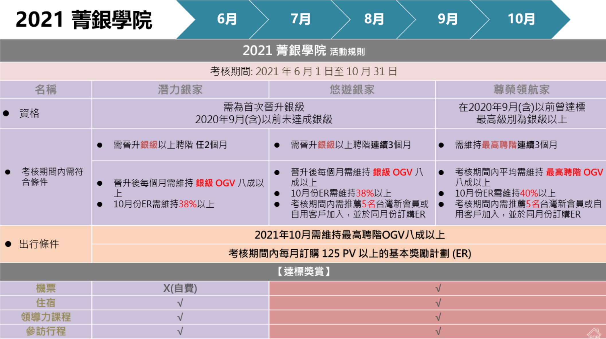 9. 本活動達標獲獎內容分階段符合:「潛力銀家」之資格 – 可參加領導力課程與參訪農場/工廠,但需自費機票及住宿之費用;「悠遊銀家」與「銀級領航家」之資格 –包含美