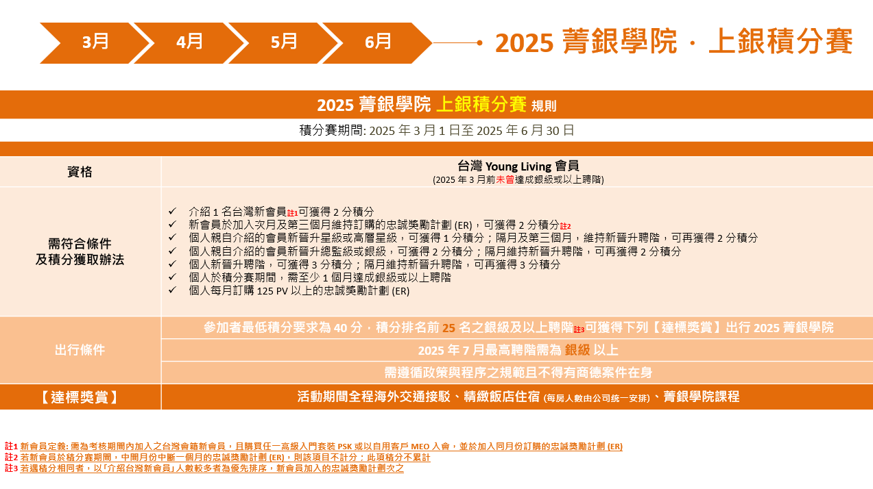 9. 本積分賽達標獲獎內容分階段符合 (如上述獎賞級別與規定):免費參加【2025 菁銀學院.上銀/穩銀積分賽】之旅 (含機票與住宿) 及各項領導課程 (悠樂芳提供課程培訓與參訪農場/工廠)。航班與住宿由台灣悠樂芳安排提供 (住房名單由悠樂芳安排),獲獎人需配合團體行程與課程時間,不得任意更動。悠樂芳僅於團體行程與課程時間內提供餐飲,其他時間則需由獲獎人自行安排。