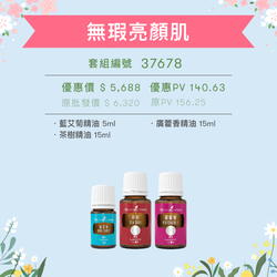 本套組內含令人舒緩放鬆的廣藿香、可強化肌膚防禦力及滋養功效的藍艾菊、搭配平衡油脂分泌的茶樹,對抗肌膚老化並打造細嫩白皙的無瑕美肌,維持青春活力展現耀眼自信美!