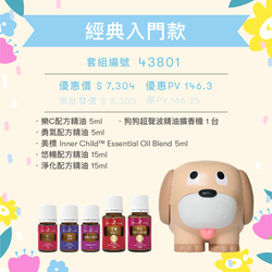 本套組內含帶有異國香氣的悠暢配方精油、讓周圍充滿潔淨感受的淨化配方精油、清涼提神的樂C配方精油、令人活力充沛的勇氣配方精油、激發內在能量的美標Inner Child Essential Oil Blend,搭配精緻可愛的狗狗超聲波精油擴香機一同使用,經典系列一次入手,全方位照顧您的生活!