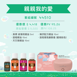 本套組內含擁有清新氛圍的樂抒配方精油、讓您煥發精神的甜橙、可帶來愉悅感受的天竺葵,及氣味香甜清新的美標綠薄荷,搭配旅行時的必備聖品旅程香氛擴香儀(蜜桃粉色),讓您時刻都能感受甜蜜的香氣圍繞!