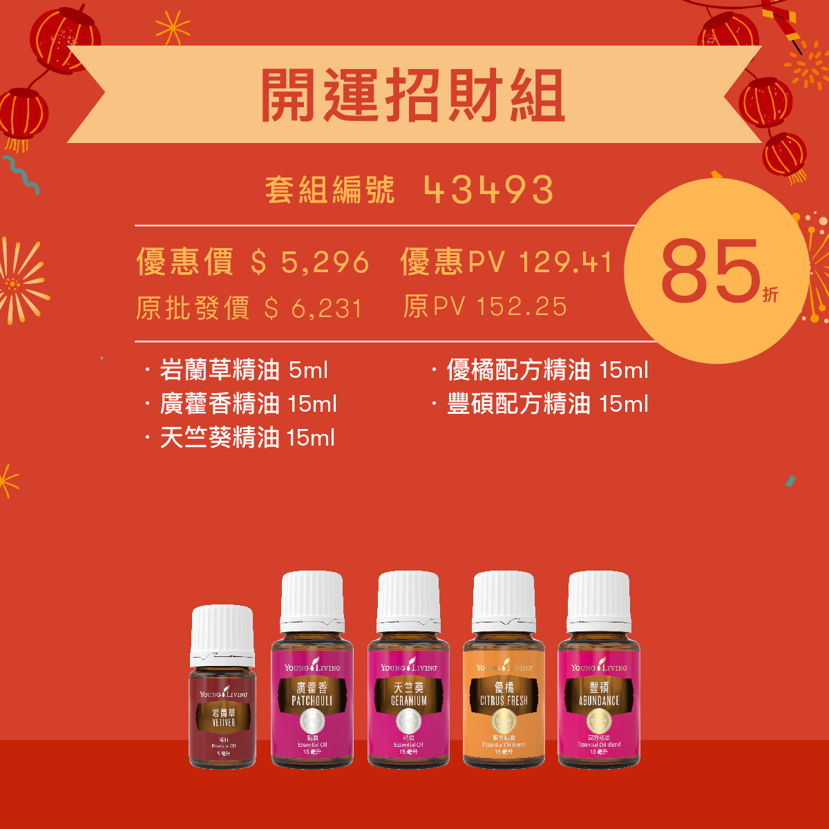 財源廣進,歡慶金龍年!此套組合包含了令人身心愉悅的廣藿香精油,能夠穩定情緒的岩蘭草精油,還有營造豐盛感受的豐碩配方精油,搭配清新花香的天竺葵。這些精油將幫助您開啟充實的生活,迎接充滿財富和幸福的龍年!
