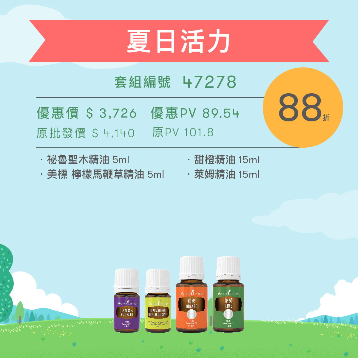不要讓炎熱的盛夏阻擋您的活力,「夏日活力」幫助您在盛夏活力也滿擋。 此套組包含帶有香甜清新的「萊姆」和「甜橙」幫助您提振情緒,平衡身心,清爽的萊姆給您活力滿檔的感受。帶有新鮮的香草氣息「檸檬馬鞭草」擁有草本木質香調,幫助您放鬆緊繃的身心,擁有輕盈的感受。強化靈性能量的「祕魯聖木」,沉穩的木質調適合靜坐冥想時使用,幫助您在盛夏時刻充飽電後繼續出發!