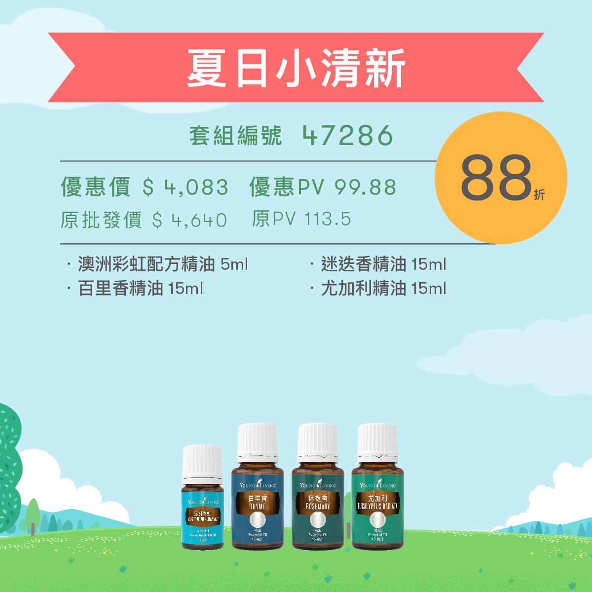 「夏日小清新」幫您擺脫盛夏的燥熱與煩悶,給您創造一個專屬沁涼的夏季。 此套組包含具有淨化作用的「百里香」,擴香時可以幫助去除異味,出門使用時可以驅趕走低落的情緒。另外還有帶著常綠灌木的「迷迭香」,大自然的香氣有如身在涼爽的森林浴裡。此套組還包含帶著木質香氣的「澳洲彩虹」,擁有了他帶給您如彩虹般美麗的思緒,清新您的空氣。最後還有清嫩的草葉香調的「尤加利」,獨特的青草氣息帶給您身心舒暢的感受。在盛夏之際擁有自己的夏日清新派對吧!