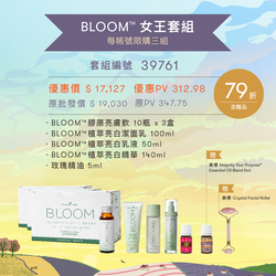 此套組內含BLOOM植萃亮白潔面乳(100毫升)*1、BLOOM植萃亮白乳液(50毫升)*1、BLOOM植萃亮白精華 (140毫升)*1,BLOOM膠原亮膚飲*(10瓶)*3、玫瑰(5毫升)*1,加贈臉部按摩滾輪*1、Magnify Your Purpose Essential Oil Blend(5毫升)*1。2021全新上市BLOOM護膚全系列商品,對於提升肌膚透亮感與增進Q彈水潤有顯著的功效,再配上玫瑰精油,本檔週年慶不能錯過的美肌組合。