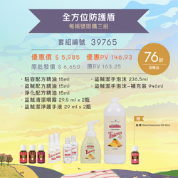 駐容(15毫升)*1、盜賊(15毫升)*1、 淨化(15毫升)*1、盜賊潔手泡沫(236.5毫升)*1、盜賊潔手泡沫-補充裝(946毫升)*1、盜賊清潔噴霧(29.5毫升)*2、盜賊潔淨護手液(29毫升)*2。加贈美標Elemi Essential Oil(15毫升)*1。