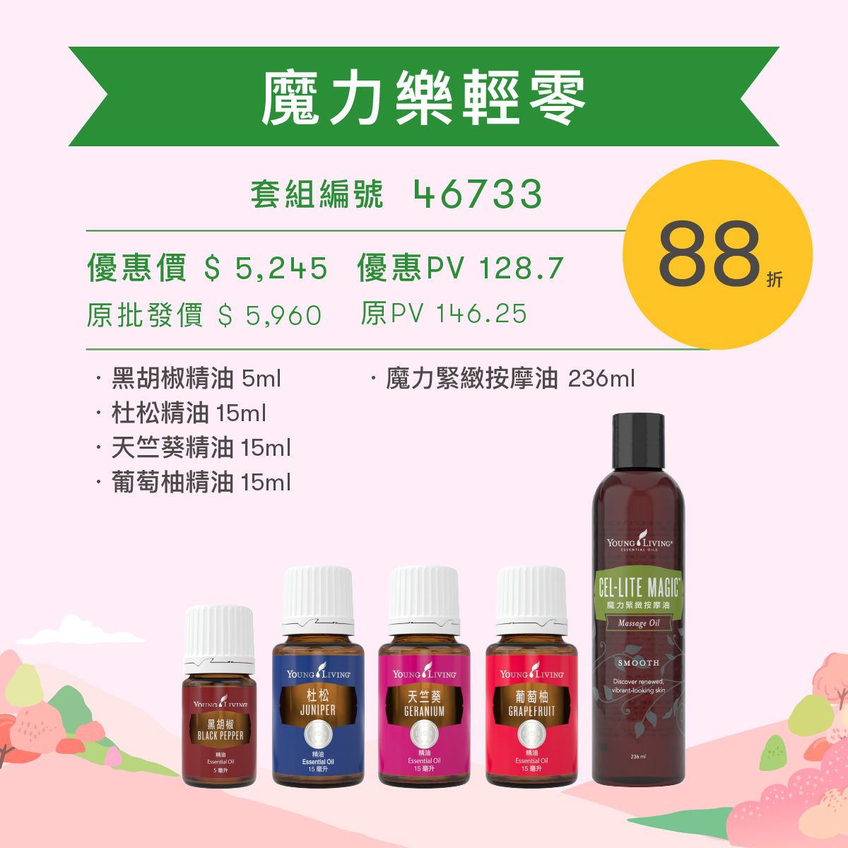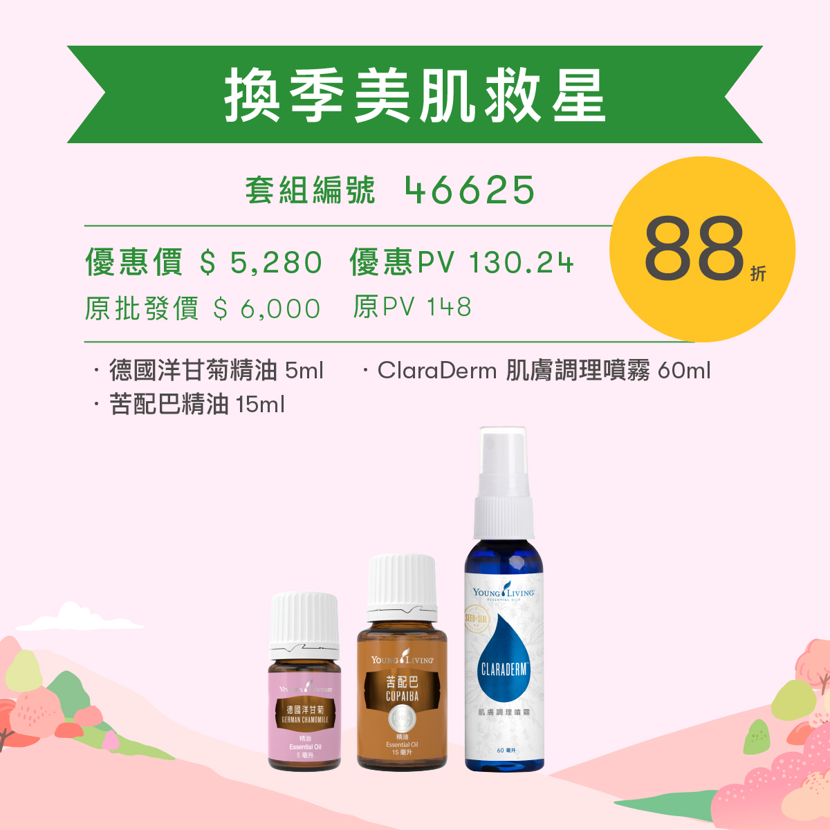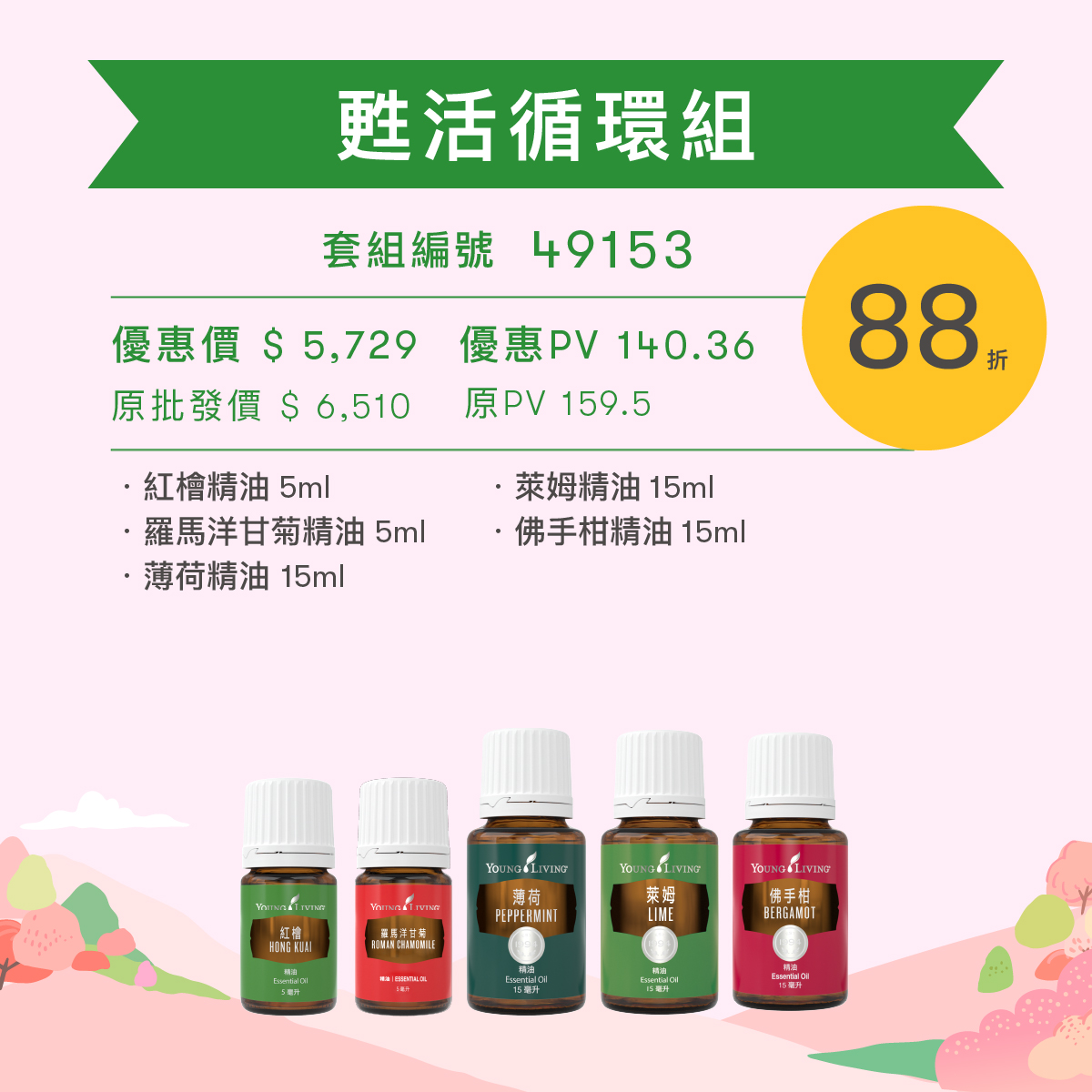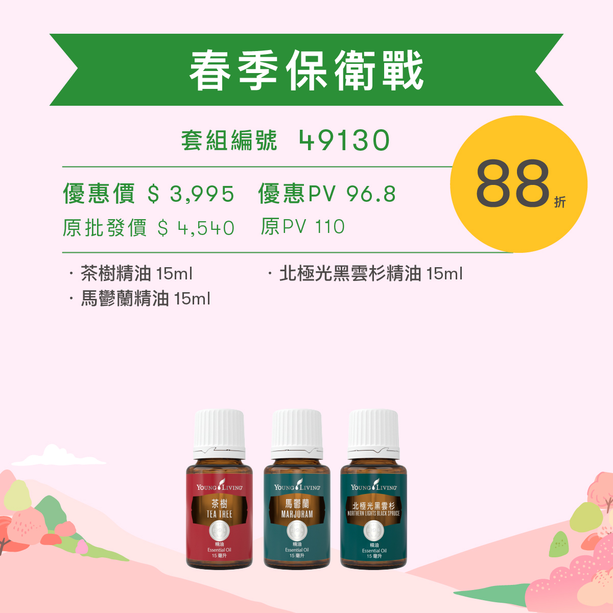 「春意盎然迎芬芳優惠套組」之PV值亦以其優惠折扣計算。例:86 折優惠品項,PV值以 86 折計算。