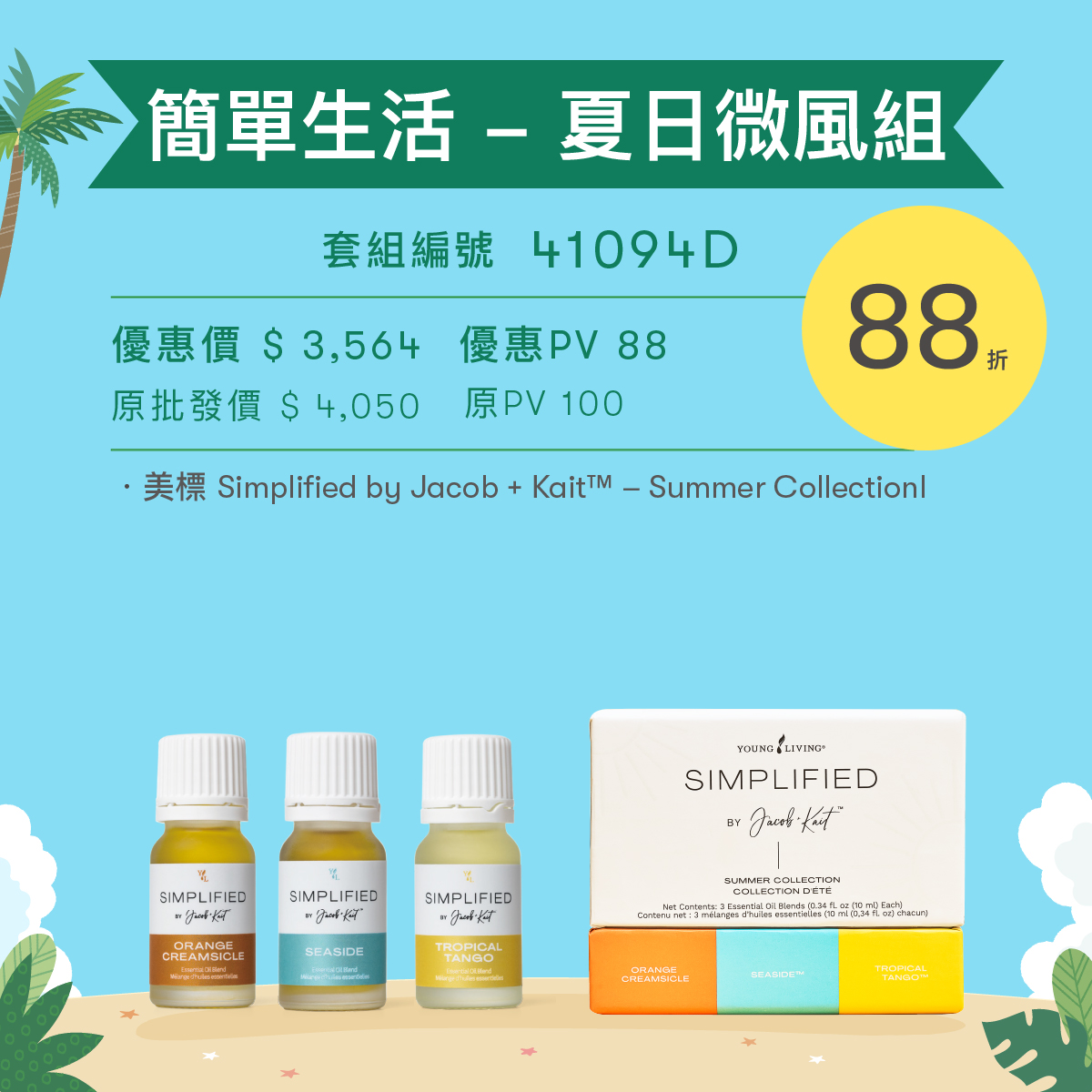 Simplified by Jacob + Kait 是專為享受氣味而設計™的一系列複方精油。 夏季系列由 Jacob 和 Kaitlyn Young 與 D. Gary Young 研究所合作推出,包含三種限時混合香氛,旨在將家居變成香氣綠洲。首先帶著您的感官踏上Tropical Tango熱帶之旅,感受熱帶探戈複方精油中椰子、橙和新鮮採摘的花卉的香氣。這款明亮、幸福的複方精油加入來自厄瓜多爾 Finca Botanica 農場的依蘭依蘭油,讓您感覺就像生活在海島時光。 當您想重溫夏日涼爽糖果的懷舊之情時,可以選擇 Orange Creamsicle 複方精油。這款奶油般的柑橘香味採用純正馬達加斯加雲呢拿製成,讓您回憶起簡單的時光和與朋友在戶外度過的夏日。 接下來,享受 Seaside 複方精油的清脆氣味。靈感來自鹹鹹的海洋空氣和溫暖的夏夜,是盛夏的愉快假期。配方亦加入來自地中海附近苦橙樹花的橙花油。 |