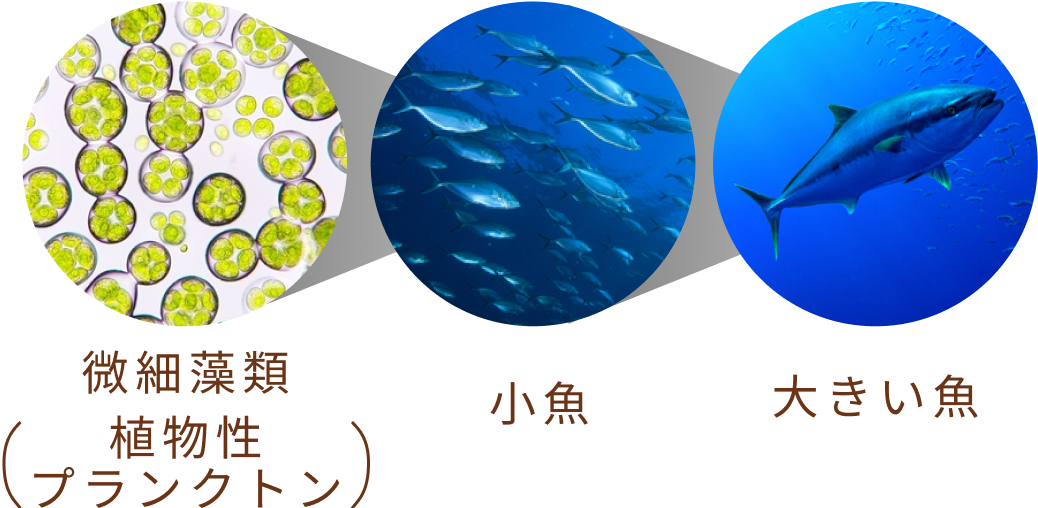 オメガ3脂肪酸DHA・EPAは、本来、植物性プランクトンである「微細藻類」が生み出し、海洋の食物連鎖の過程で魚に取り込まれ、蓄積されたものを抽出してきました。